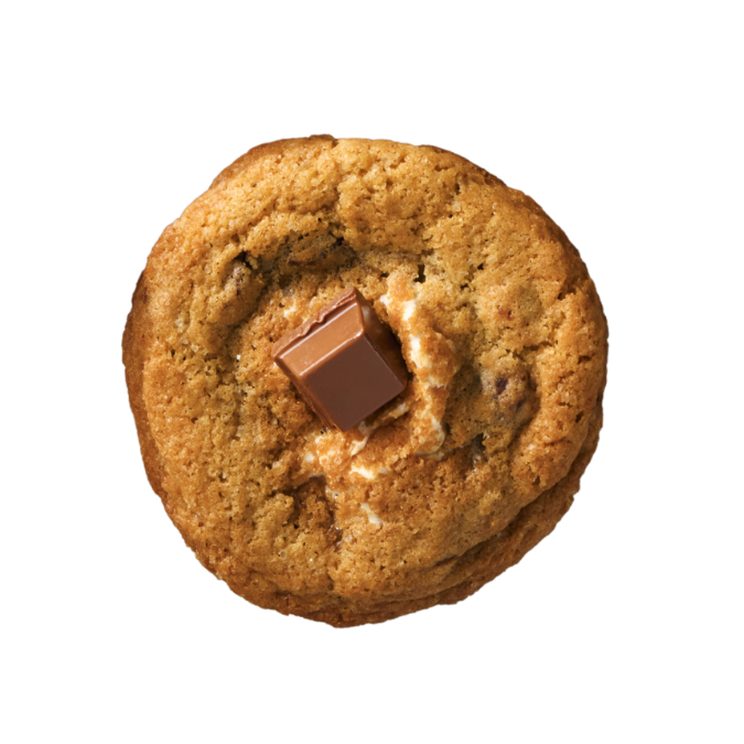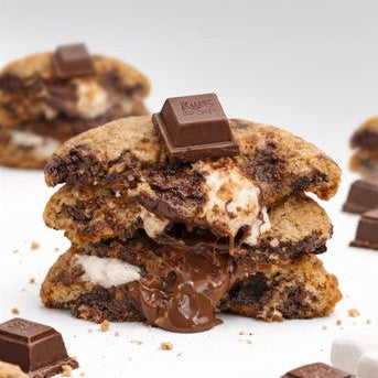 Chewy s’mores cookie filled with gooey marshmallow, chocolate, graham crackers, and chocolate on top.